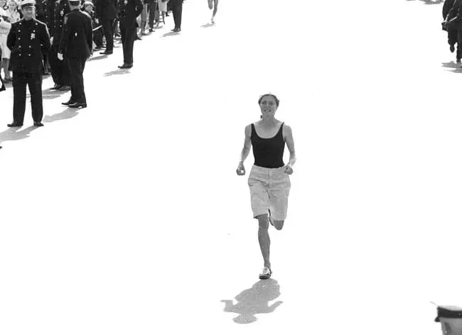 1966年波士顿马拉松,Bobbi Gibb藏在起跑线附近的灌木丛中,等待发令枪响后,偷偷混入参赛人群。