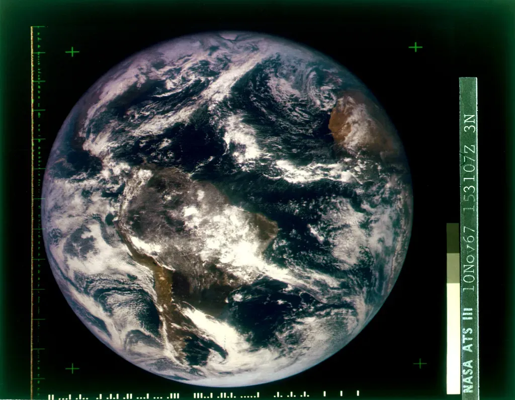 地球的第一张彩色图像是由ATS-3卫星在1967年拍摄的图像合成的,它被用作《全球概览》第一版的封面图像。